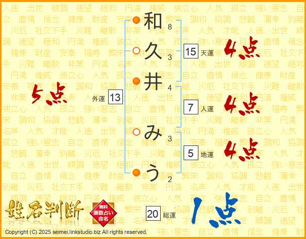 生活面を象徴する運勢です。外部から受ける影響力を表し、結婚運、家庭運や職場、環境への順応性を表します。総運から人運を引いた画数。姓や名が1文字の場合を除く。