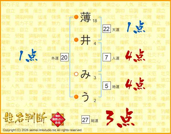 薄井みうさんの天運は22画の1点!