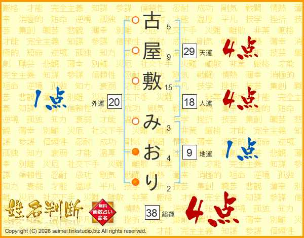 古(5画)屋(9画)敷(15画) み(3画)お(4画)り(2画)