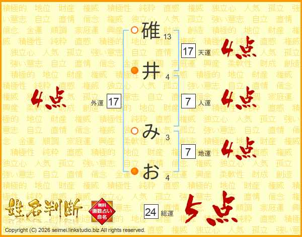 生活面を象徴する運勢です。外部から受ける影響力を表し、結婚運、家庭運や職場、環境への順応性を表します。総運から人運を引いた画数。姓や名が1文字の場合を除く。