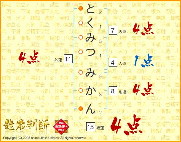 生活面を象徴する運勢です。外部から受ける影響力を表し、結婚運、家庭運や職場、環境への順応性を表します。総運から人運を引いた画数。姓や名が1文字の場合を除く。
