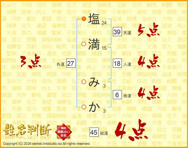 生活面を象徴する運勢です。外部から受ける影響力を表し、結婚運、家庭運や職場、環境への順応性を表します。総運から人運を引いた画数。姓や名が1文字の場合を除く。
