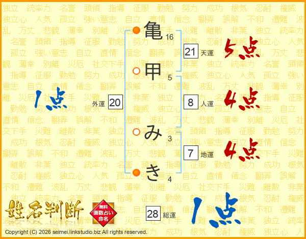 画数の奇数(○陽)と偶数(●陰)の配列で吉凶を占います。どちらかにかたよる名前は大凶名で避ける必要があります。画数の奇数偶数。