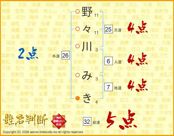 生活面を象徴する運勢です。外部から受ける影響力を表し、結婚運、家庭運や職場、環境への順応性を表します。総運から人運を引いた画数。姓や名が1文字の場合を除く。