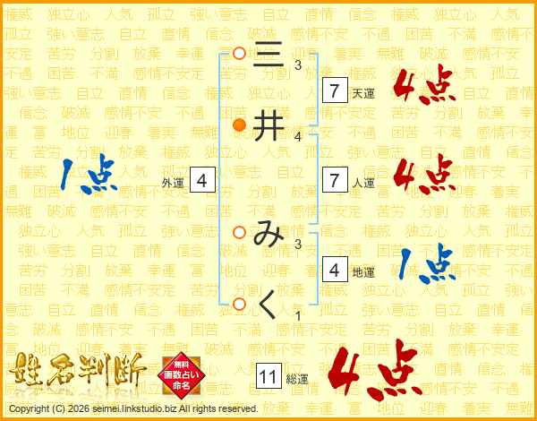 生活面を象徴する運勢です。外部から受ける影響力を表し、結婚運、家庭運や職場、環境への順応性を表します。総運から人運を引いた画数。姓や名が1文字の場合を除く。
