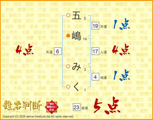 生活面を象徴する運勢です。外部から受ける影響力を表し、結婚運、家庭運や職場、環境への順応性を表します。総運から人運を引いた画数。姓や名が1文字の場合を除く。