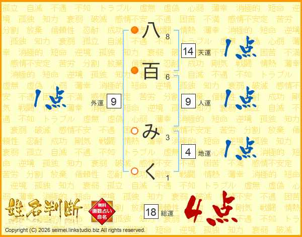 生活面を象徴する運勢です。外部から受ける影響力を表し、結婚運、家庭運や職場、環境への順応性を表します。総運から人運を引いた画数。姓や名が1文字の場合を除く。