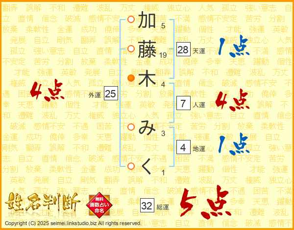 加(5画)藤(19画)木(4画) み(3画)く(1画)