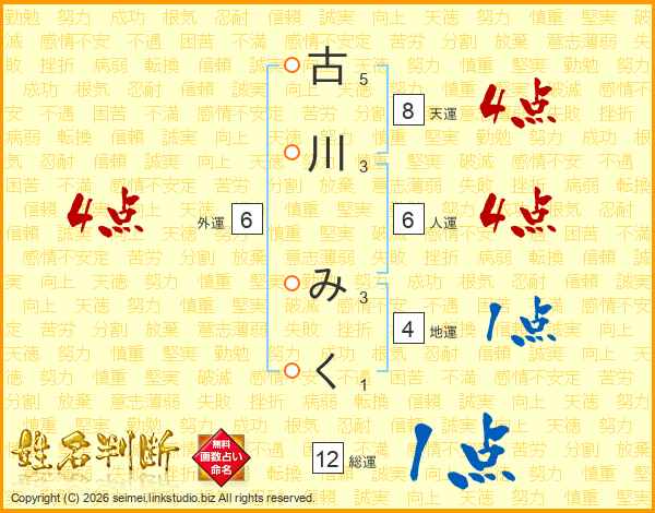 生活面を象徴する運勢です。外部から受ける影響力を表し、結婚運、家庭運や職場、環境への順応性を表します。総運から人運を引いた画数。姓や名が1文字の場合を除く。