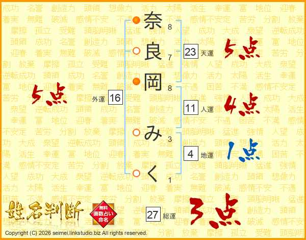 奈(8画)良(7画)岡(8画) み(3画)く(1画)