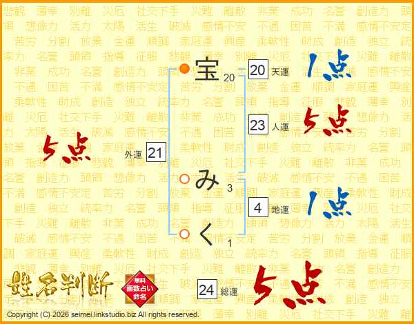 生活面を象徴する運勢です。外部から受ける影響力を表し、結婚運、家庭運や職場、環境への順応性を表します。総運から人運を引いた画数。姓や名が1文字の場合を除く。