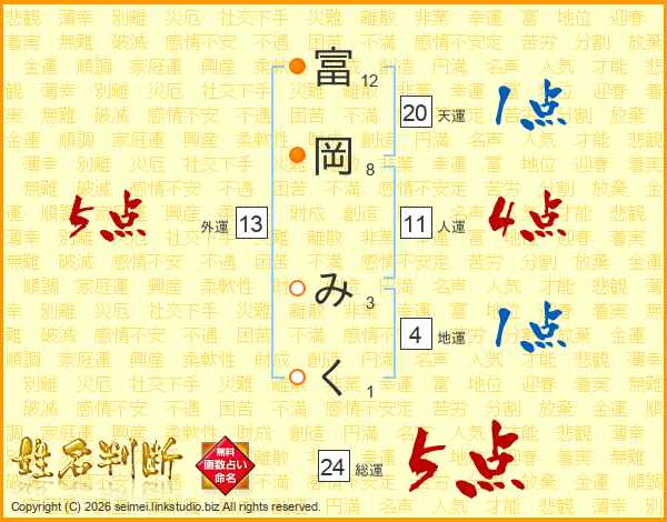 生活面を象徴する運勢です。外部から受ける影響力を表し、結婚運、家庭運や職場、環境への順応性を表します。総運から人運を引いた画数。姓や名が1文字の場合を除く。