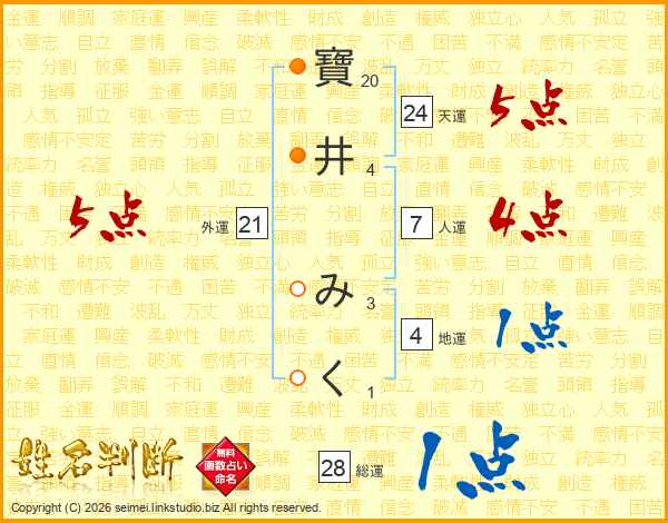 生活面を象徴する運勢です。外部から受ける影響力を表し、結婚運、家庭運や職場、環境への順応性を表します。総運から人運を引いた画数。姓や名が1文字の場合を除く。