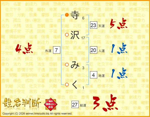 生活面を象徴する運勢です。外部から受ける影響力を表し、結婚運、家庭運や職場、環境への順応性を表します。総運から人運を引いた画数。姓や名が1文字の場合を除く。