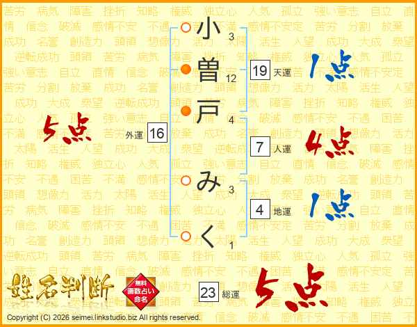 生活面を象徴する運勢です。外部から受ける影響力を表し、結婚運、家庭運や職場、環境への順応性を表します。総運から人運を引いた画数。姓や名が1文字の場合を除く。