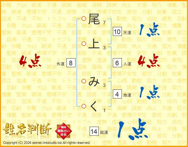 生活面を象徴する運勢です。外部から受ける影響力を表し、結婚運、家庭運や職場、環境への順応性を表します。総運から人運を引いた画数。姓や名が1文字の場合を除く。