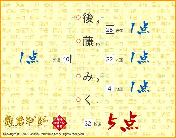 生活面を象徴する運勢です。外部から受ける影響力を表し、結婚運、家庭運や職場、環境への順応性を表します。総運から人運を引いた画数。姓や名が1文字の場合を除く。