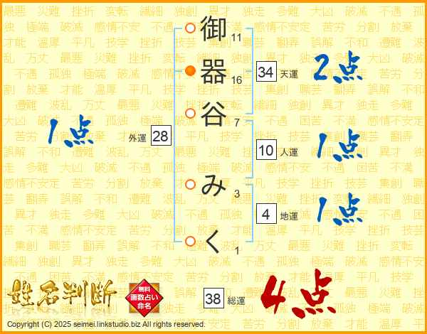 御(11画)器(16画)谷(7画) み(3画)く(1画)