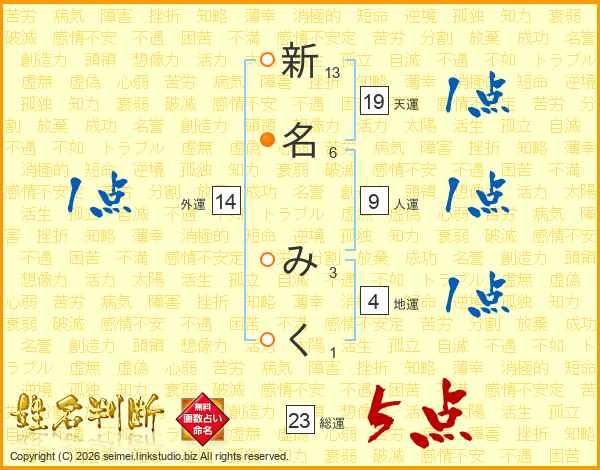 生活面を象徴する運勢です。外部から受ける影響力を表し、結婚運、家庭運や職場、環境への順応性を表します。総運から人運を引いた画数。姓や名が1文字の場合を除く。