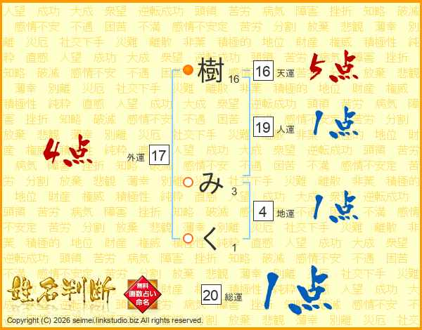 樹みくさんの人運は19画の1点!