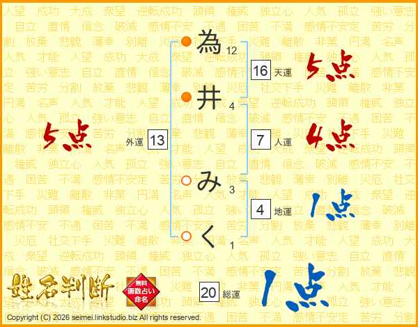 生活面を象徴する運勢です。外部から受ける影響力を表し、結婚運、家庭運や職場、環境への順応性を表します。総運から人運を引いた画数。姓や名が1文字の場合を除く。