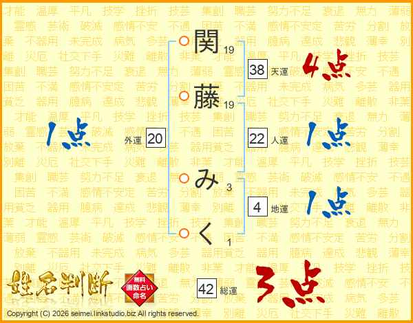 生活面を象徴する運勢です。外部から受ける影響力を表し、結婚運、家庭運や職場、環境への順応性を表します。総運から人運を引いた画数。姓や名が1文字の場合を除く。