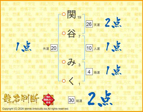 生活面を象徴する運勢です。外部から受ける影響力を表し、結婚運、家庭運や職場、環境への順応性を表します。総運から人運を引いた画数。姓や名が1文字の場合を除く。