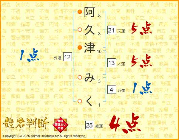 阿久津みくさんの人運は13画の5点!