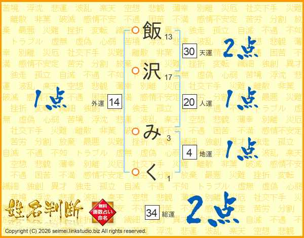 生活面を象徴する運勢です。外部から受ける影響力を表し、結婚運、家庭運や職場、環境への順応性を表します。総運から人運を引いた画数。姓や名が1文字の場合を除く。