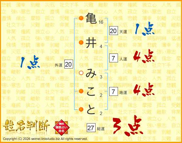 亀(16画)井(4画) み(3画)こ(2画)と(2画)