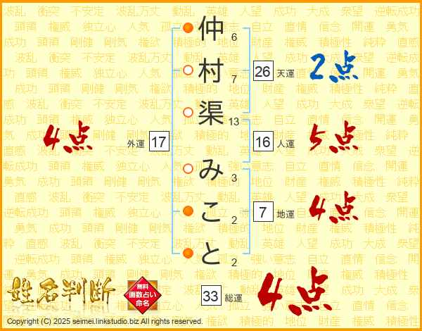 生活面を象徴する運勢です。外部から受ける影響力を表し、結婚運、家庭運や職場、環境への順応性を表します。総運から人運を引いた画数。姓や名が1文字の場合を除く。