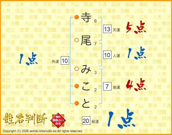 寺(6画)尾(7画) み(3画)こ(2画)と(2画)
