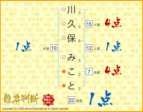 生活面を象徴する運勢です。外部から受ける影響力を表し、結婚運、家庭運や職場、環境への順応性を表します。総運から人運を引いた画数。姓や名が1文字の場合を除く。