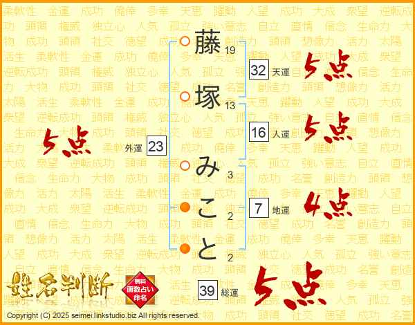 藤塚みことさんの総運は39画の5点!