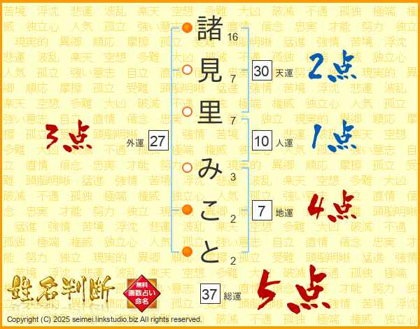 諸(16画)見(7画)里(7画) み(3画)こ(2画)と(2画)