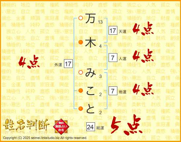 万(13画)木(4画) み(3画)こ(2画)と(2画)