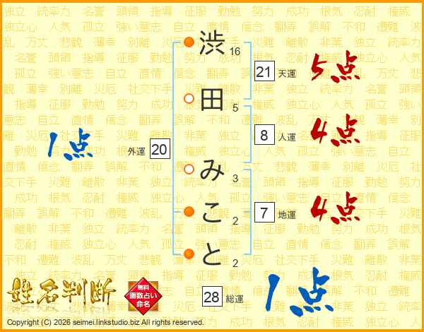 渋田みことさんの総運は28画の1点!