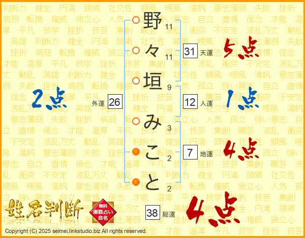 生活面を象徴する運勢です。外部から受ける影響力を表し、結婚運、家庭運や職場、環境への順応性を表します。総運から人運を引いた画数。姓や名が1文字の場合を除く。