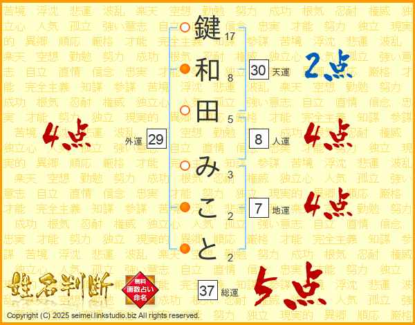 鍵和田みことさんの総運は37画の5点!