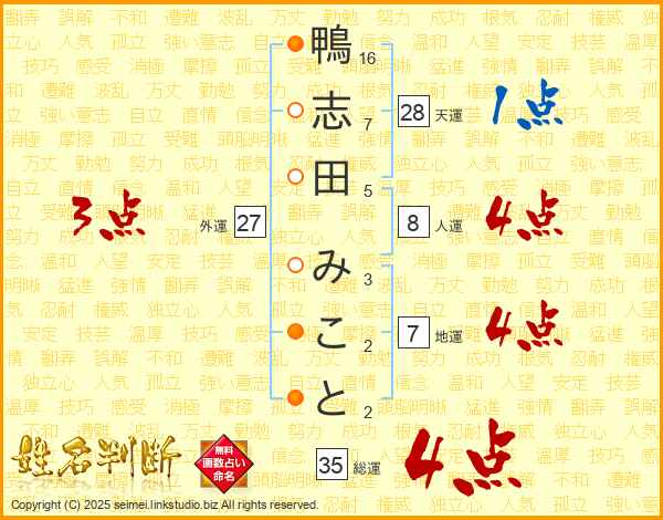 鴨(16画)志(7画)田(5画) み(3画)こ(2画)と(2画)