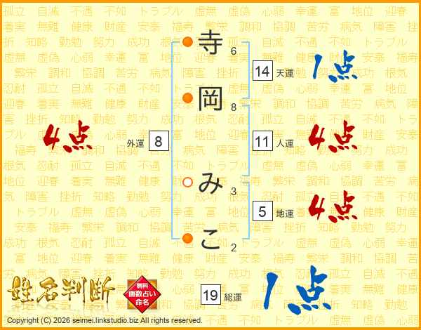 生活面を象徴する運勢です。外部から受ける影響力を表し、結婚運、家庭運や職場、環境への順応性を表します。総運から人運を引いた画数。姓や名が1文字の場合を除く。