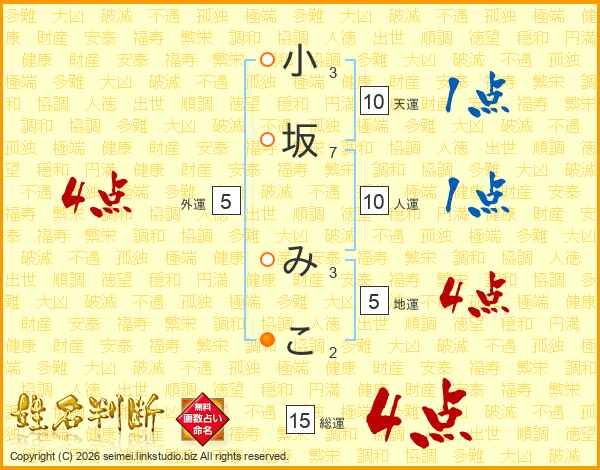 小坂みこさんの総運は15画の4点!