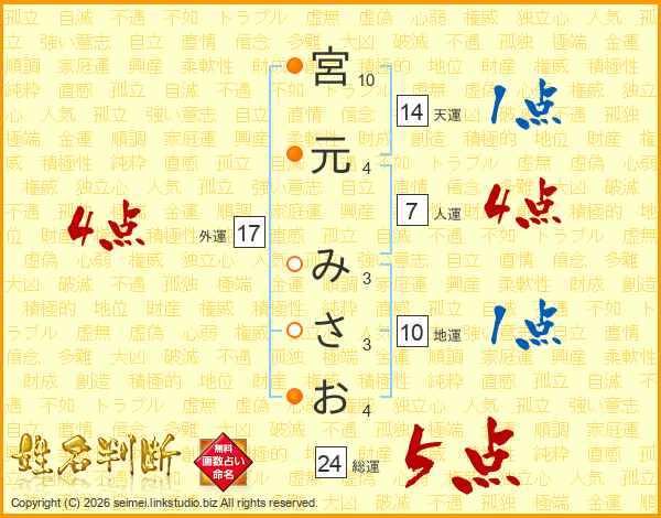 宮元みさおさんの総運は24画の5点!