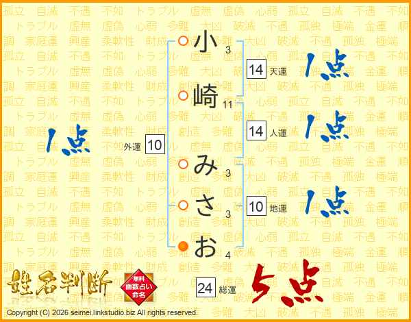 小崎みさおさんの人運は14画の1点!