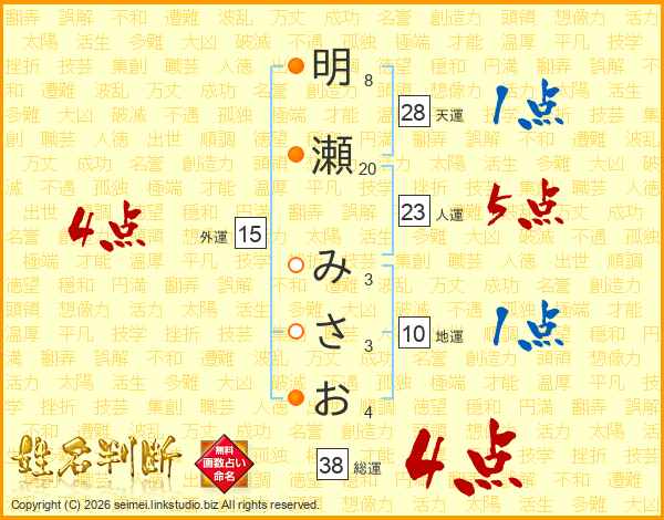 明(8画)瀬(20画) み(3画)さ(3画)お(4画)