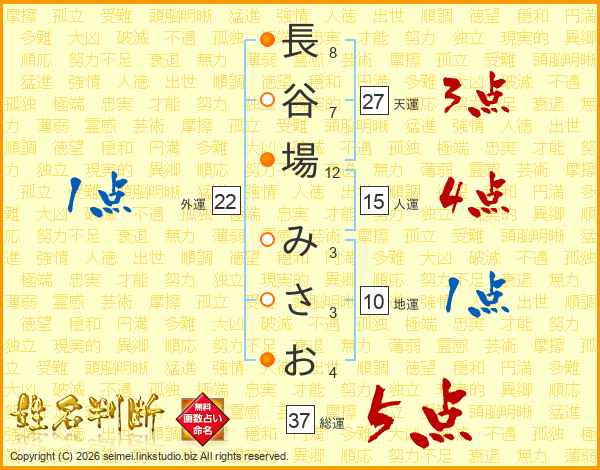 長(8画)谷(7画)場(12画) み(3画)さ(3画)お(4画)