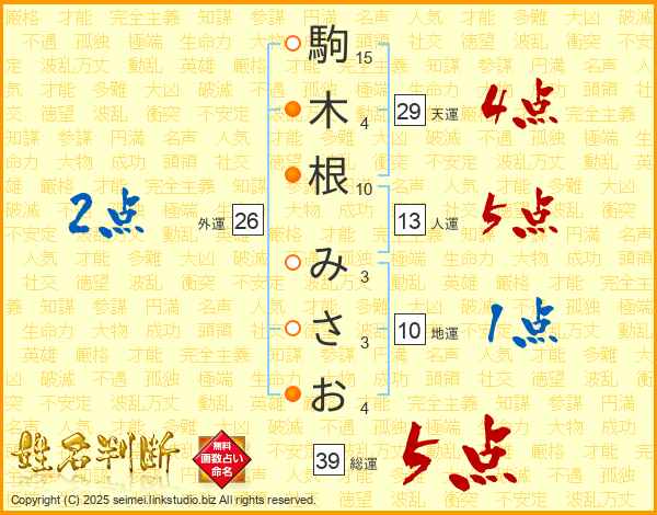 駒(15画)木(4画)根(10画) み(3画)さ(3画)お(4画)