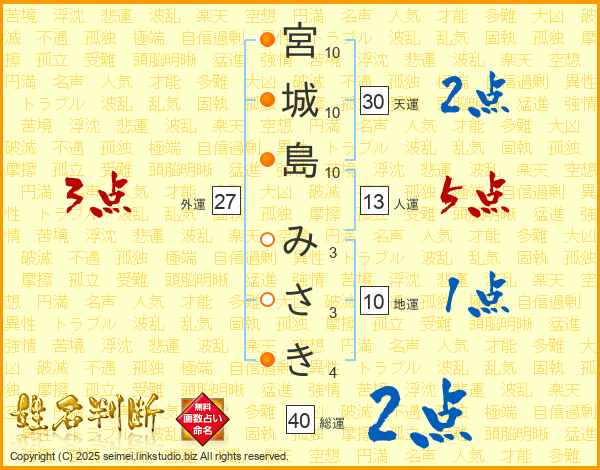 生活面を象徴する運勢です。外部から受ける影響力を表し、結婚運、家庭運や職場、環境への順応性を表します。総運から人運を引いた画数。姓や名が1文字の場合を除く。