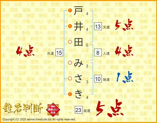 生活面を象徴する運勢です。外部から受ける影響力を表し、結婚運、家庭運や職場、環境への順応性を表します。総運から人運を引いた画数。姓や名が1文字の場合を除く。