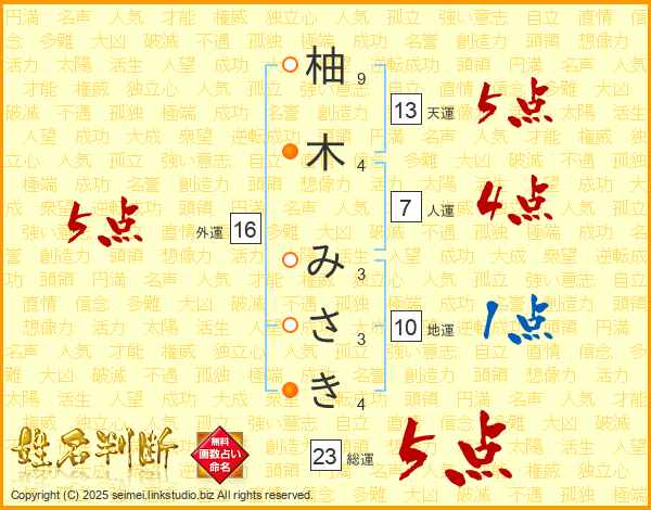 柚(9画)木(4画) み(3画)さ(3画)き(4画)